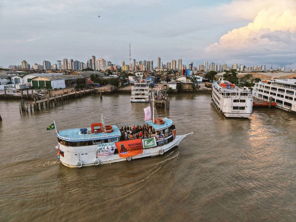 La Flotilla Amazónica Yaku Mama llegó a Belém do Pará el domingo 10 de noviembre, justo a tiempo para unirse a las negociaciones climáticas de la COP30. CRÉDITO DE IMAGEN: Flotilla Amazónica Yaku Mama
