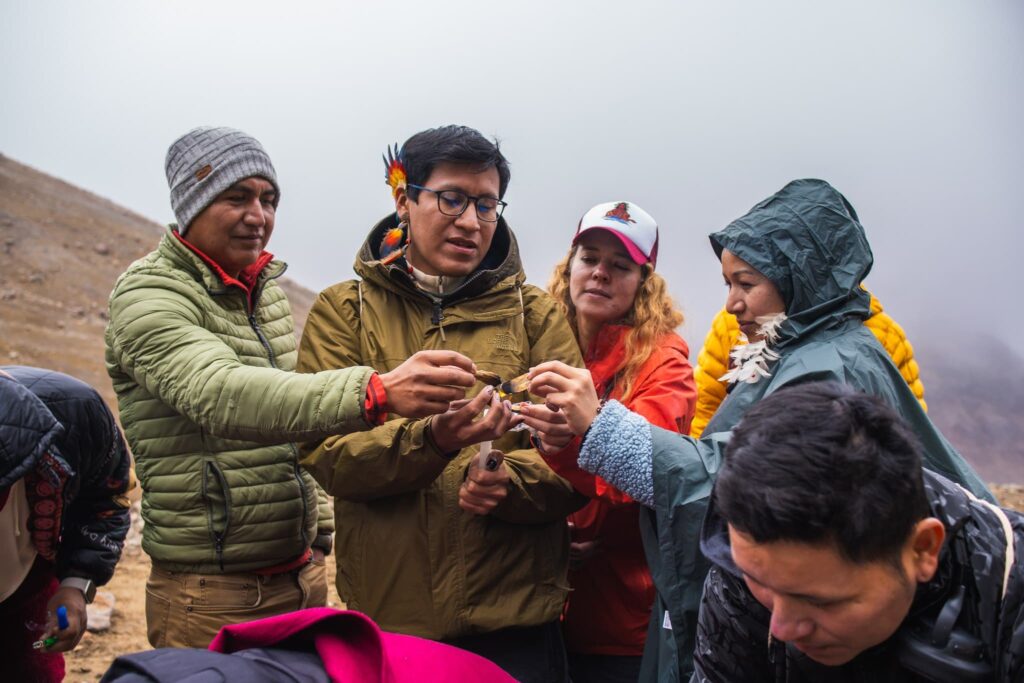 No alto da Mama Cayambe, huaca sagrada dos povos kichwa andinos, vivenciamos uma cerimônia ancestral, focada na importância das geleiras, dos páramos andinos e sua conexão com a Amazônia. Aqui também elevamos uma mensagem clamando pela conscientização de que esse ciclo está ameaçado pelo desmatamento e pelas mudanças climáticas. Saudando e recolhendo a energia e a força dos indígenas dos Andes, comunidades que se encontravam em resistência — povo Kayambi, Otavalo, Natabuela, Karanki —, iniciamos o percurso.