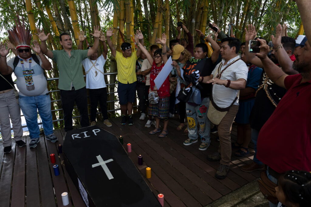 Carregados com as impressões do toxic tour, na manhã seguinte nossa tripulação da Flotilha Yaku Mama participou da Roda de Conversa: “O Fim dos Combustíveis Fósseis” e da ação simbólica “Funeral dos Combustíveis Fósseis”. Na primeira parte desta atividade, ouvimos uma exposição detalhada dos danos ocasionados pela expansão da exploração petrolífera na Amazônia, assim como as palavras de líderes e lideranças de diferentes latitudes da Amazônia equatoriana, peruana, colombiana e brasileira.