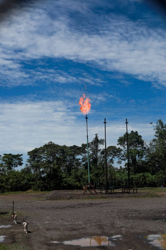Percorremos também espaços onde observamos os conhecidos mecheros (queimadores), grandes estruturas que conduzem o gás natural liberado dos poços de petróleo e o encaminham para grandes estruturas para ser incinerado. Eles causam danos principalmente ao ar, pois geram fumaça e cinzas. Ao redor, os insetos e outros animais da selva são afetados, pois se sentem atraídos pela luz e acabam incinerados.