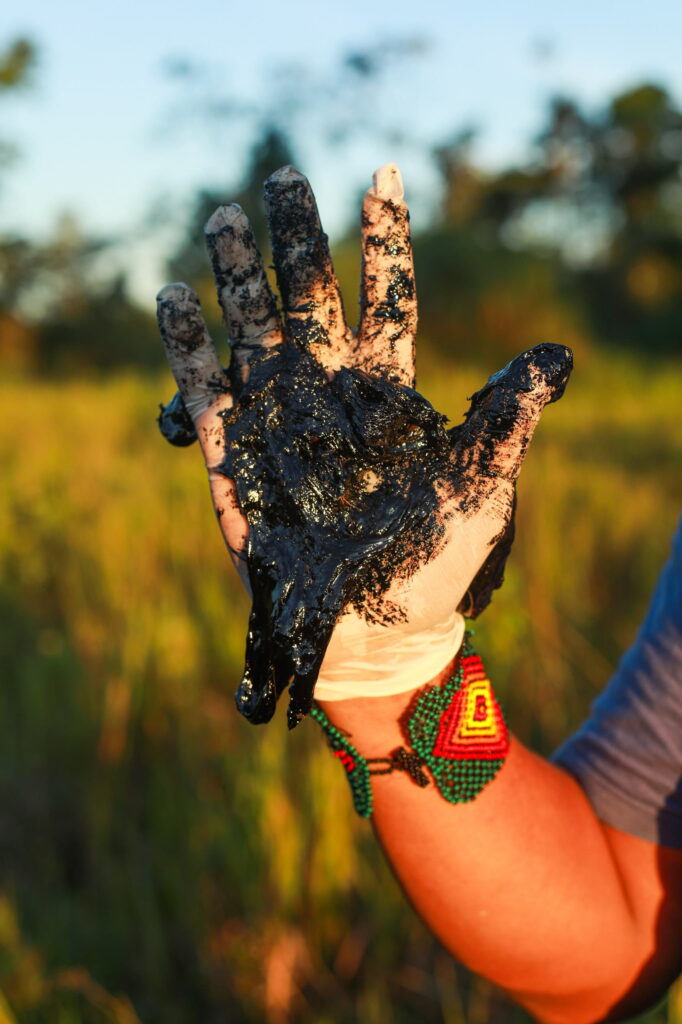 Estivemos perto de locais onde eram descartadas águas de formação, uma mistura de petróleo com outros minerais, incluindo água, que eram derramadas diretamente na terra. Passaram-se mais de 40 anos desde as primeiras extrações e até hoje, ao cavar duas ou três pás, encontram-se manchas negras na terra. Isso demonstra a negligência das empresas que realizaram esses trabalhos, assim como do Estado equatoriano, que não provê centros de saúde nem formas de compensar as afetações das quais a população foi vítima.